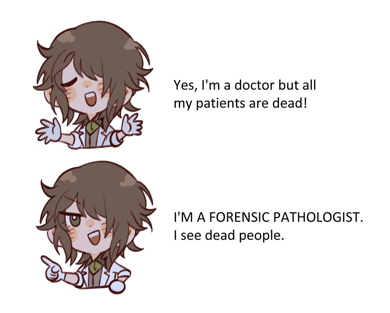How does one even begin to describe Hayden as a person? A wildcard, the joker, a compulsive liar. As someone who's worked up close and personal with death, Hayden is naturally eccentric with a funny bone for the macabre. She can be overdramatic and a thrill seeker, playing herself up with theatrics. Hayden speaks highly about herself yet never actually talks about herself. Things like "you can always count on me to get the job done" or "you needn't worry about a thing." She has a certain way with words that you can call manipulative, a way that can lull you into a false sense of security and misplaced trust in her if you're not too careful. This isn't to say she's deceitful, but she has a tendency to go off on her own and do things her way. She parades around like the walking definition of a god complex, functioning on her own whims. Hayden views the world in the lens of a nihilist who's figured out the trick to life is to play it like a game that she's here to win. She has an odd way of being helpful, whether it's out of the goodness of her heart or just to stroke her own ego, it's hard to tell. If you asked her why she became a forensic pathologist, she'd tell you it's to give others peace of mind by exposing the truth. A messiah complex too? It's more likely than you think!But of course, this woman is just overcompensating. Never really receiving praise from her parents as a child led her to seek validation elsewhere. Hayden's always doing the most to impress. But she always blames her mistakes and shortcomings on outside forces, never taking full responsibility for her failings, she's too prideful for that. Hayden is serious about not taking those kinds of inconveniences seriously. You cheat death once and suddenly you got things figured out, that's how it works, right? You pick up and restart again. In truth, Hayden is highly paranoid and goes through great lengths to distance herself from others on a personal level. She's the sort of person who will talk to others but never opens up about herself, and when she does, it's like a game of two truths and a lie. She's two faced and insecure but if anyone pointed that out, she'd merely laugh it off."Haha! Ooh, you got me!"But just because she has a seemingly lax personality doesn't mean she isn't serious in the workplace. In fact, she's quite meticulous when it comes to small details about anyone, alive or deceased even. Because of this heavy attention to detail, however, Hayden often overthinks things. She has a need to be right and therefore has to consider all her options after all! There's no room for error if there are people who rely on your work. She's dutiful when it matters most and goes all in with her stubbornness to prove herself.